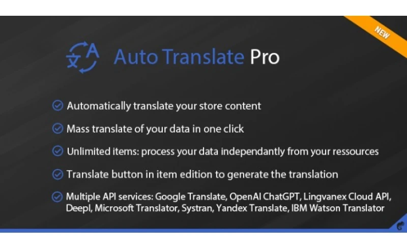 Auto Translate Pro, OpenCart mağazanızın içeriğini otomatik olarak farklı dillere çevirmenizi sağlayan gelişmiş bir çeviri modülüdür. Google Translate API, DeepL, Microsoft Translator, Systran, Yandex Translate, IBM Watson Translator, Rapid API, OpenAI ChatGPT ve Lingvanex Cloud API gibi birçok popüler çeviri servisleriyle entegre çalışır.