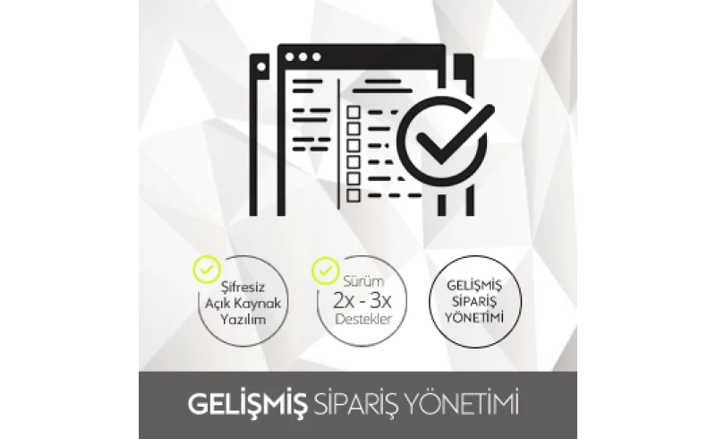 Gelişmiş sipariş yönetimi, anlaşmalı olduğunuz kargo firmaları ile sistem üzerinden kayıt oluşturularak başlar. En az iki kargoyla çalışmanız önerilir. Müşterinin istediği kargo firmasını seçmesi sağlanabilir. Yönetim panelinde eklentiler bölümünden sipariş alma, yönetme ve gönderme seçenekleri kullanılabilir.