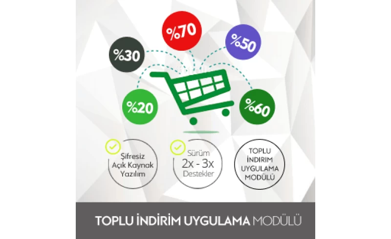 Opencart Toplu İndirim Uygulama Modülü, OpenCart Eticaret Paketleri listesinde yer almaktadır.